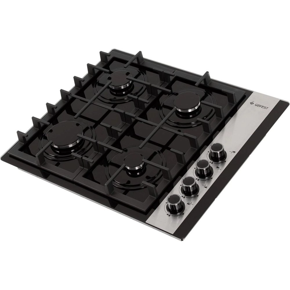 Черная, со стеклянной рабочей поверхностью варочная панель шириной 60 см. Поворотные переключатели установлены на декорированной накладке из нержавеющей стали. Газовые конфорки (две среднего размера, большая и экономичная) дополнены составными чугунными решетками. Все горелки оснащены газ-контролем и электроподжигом, есть фиксированное положение минимального пламени.