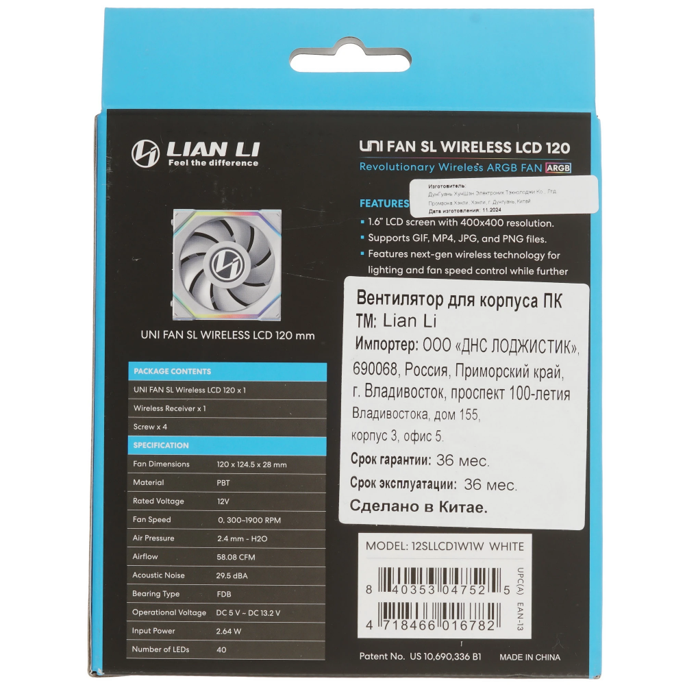 Lian Li UNI FAN SL Wireless LCD 120mm (G99.12SLLCD1W1W.00) — это корпусной вентилятор, сочетающий беспроводную синхронизацию, интегрированный ЖК-дисплей и двухзонную ARGB-подсветку. Он избавляет от лишних кабелей, легко интегрируется в экосистему Lian Li и позволяет отображать системную информацию или кастомные визуальные элементы прямо на вентиляторе. Идеален для сборок, где важны эстетика, функциональность и удобство монтажа.
