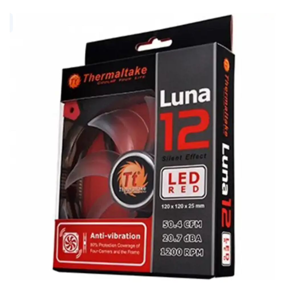 Вентилятор Thermaltake Luna 12 LED оснащён антивибрационной системой, которая снижает уровень вибрации на 80%. Благодаря специальной форме лопастей, увеличивается объём прокачиваемого воздуха и снижается уровень шума. Широкая рама вентилятора увеличивает общий поток воздуха на 60%, обеспечивая лучшее охлаждение. Доступен в трёх вариантах LED-подсветки: красный, белый и синий.