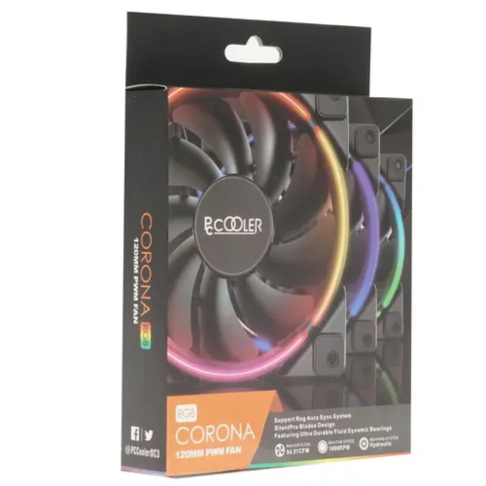 Вентилятор PCCooler CORONA – это идеальный температурный режим и безопасность для вашего системного блока, в совокупности с крайне низким уровнем шума при работе. Этот вентилятор со стандартными габаритами 120x120 мм и шириной 25 мм способен обеспечить направленный охлаждающий поток воздуха на уровне до 54.55 CFM. При этом для более эффективной работы PCCooler CORONA имеет опцию автоматической регулировки оборотов (PWM), что позволит оптимально задействовать данный вентилятор в зависимости от нагрузки на систему. При этом количество оборотов будет варьироваться от 800 до 1800 об/мин. Уровень рабочего шума от данного вентилятора составит, соответственно, от 8 до 31.4 дБ. В основе данной модели надежный подшипник качения, благодаря которому данный вентилятор сможет гарантированно обеспечить вашему системному блоку 30000 часов безотказной работы. Внешний дизайн PCCooler CORONA, благодаря яркой многоцветной подсветке, просто завораживает взгляд при работе.