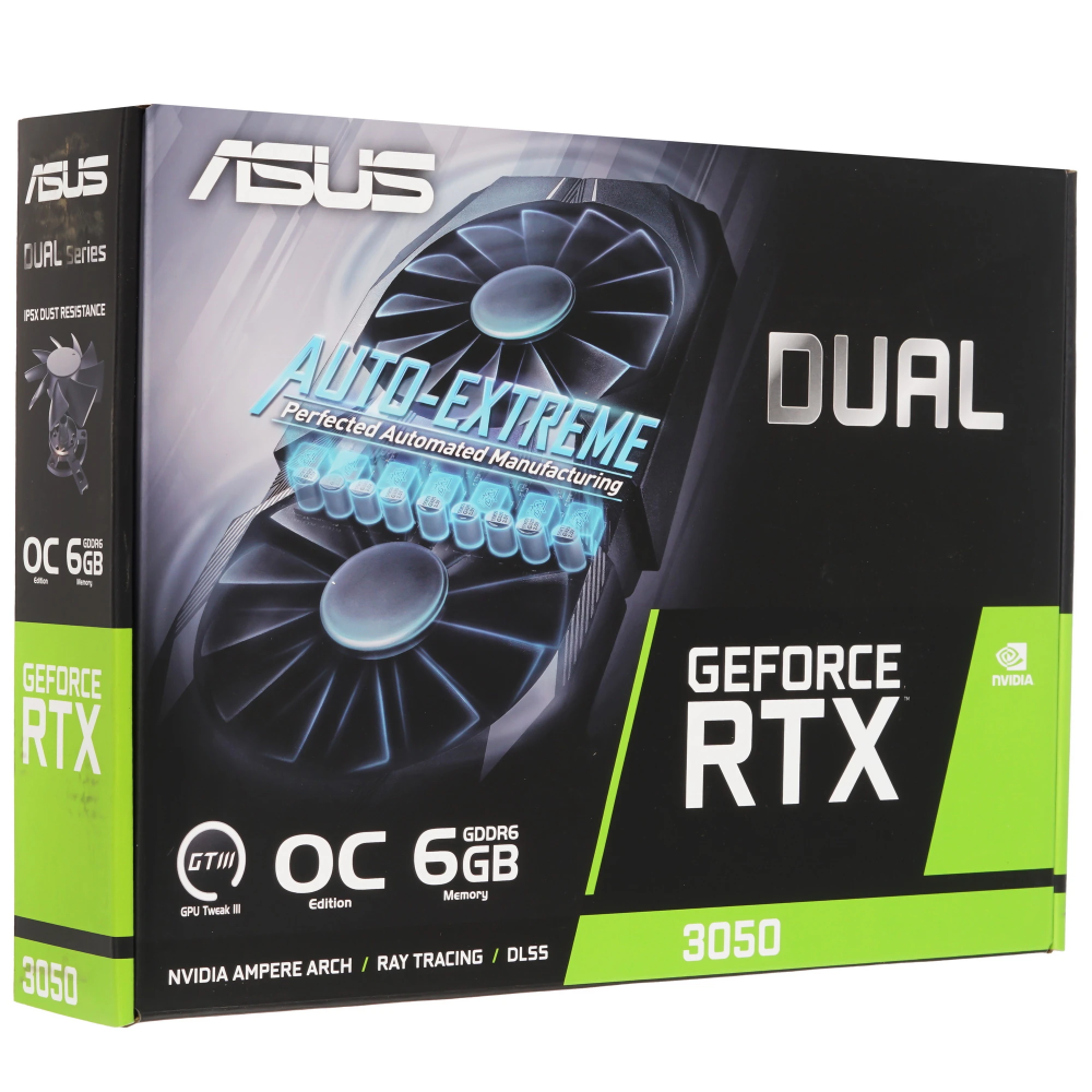 Видеокарта ASUS GeForce RTX 3050 Dual OC Edition обеспечивает высокое качество графики. Она использует видеопамять GDDR6 объемом 6 ГБ. Модель работает на частоте 1042 МГц, поддерживая разгон до 1537 МГц при работе в мощных игровых приложениях. Благодаря разъемам DVI-D, DisplayPort и HDMI возможно подключение одновременно до 3 мониторов.