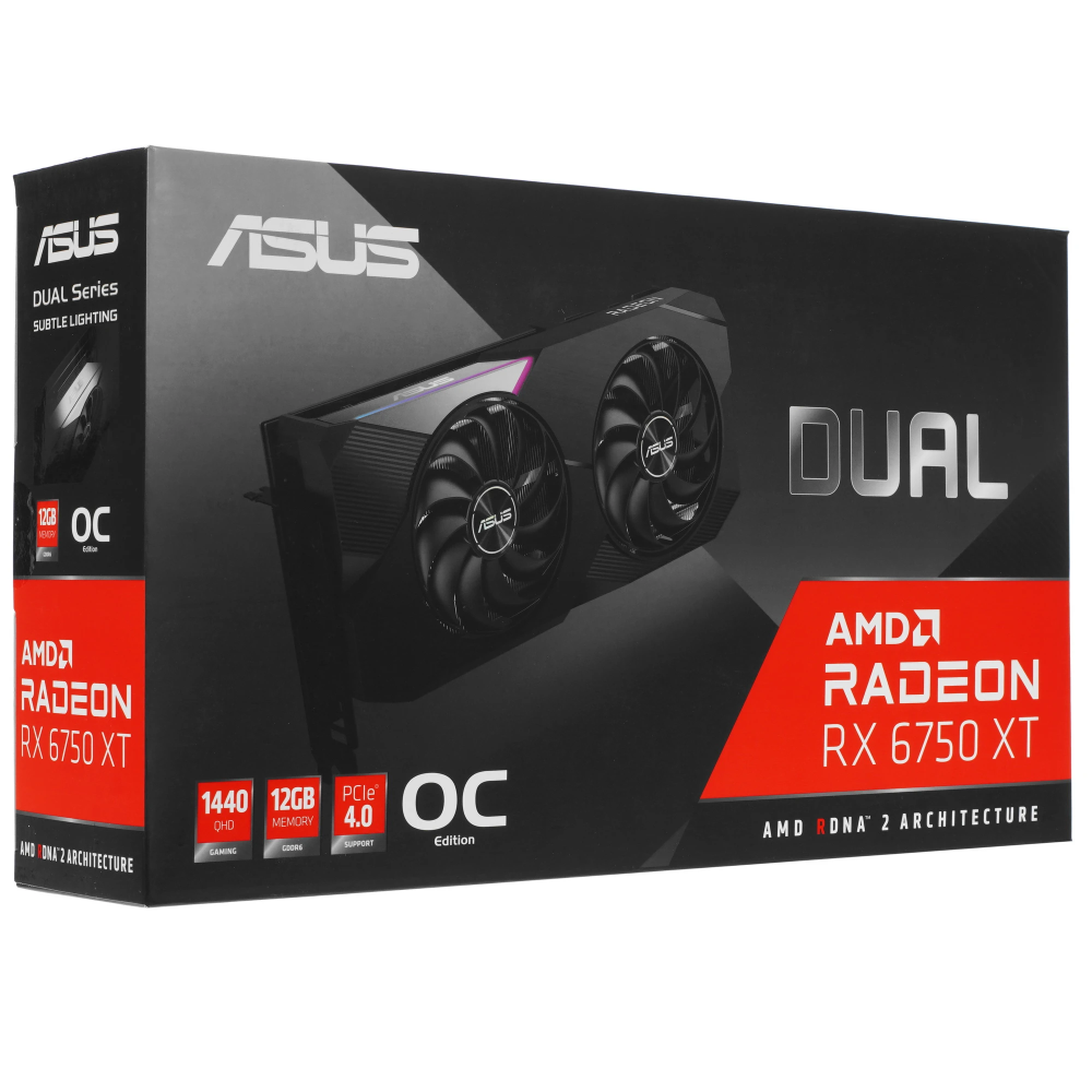 Видеокарта ASUS AMD Radeon RX 6750 XT Dual OC Edition создана для повышения производительности в играх и программах. Благодаря микроархитектуре AMD RDNA 2, многоядерному чипу и 12 ГБ памяти стандарта GDDR6 достигается стабильная вычислительная мощность с плавным отображением динамичных сцен. Процессор функционирует на частоте 2150 МГц, способной повышаться до показателя 2638 МГц.