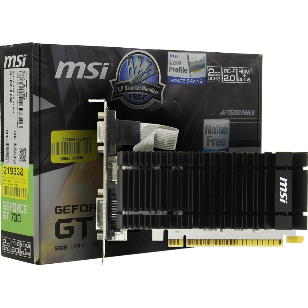 Существенным плюсом видеокарты MSI GeForce GT 730 Silent LP является возможность подсоединить к ней до двух мониторов одновременно. Для корректного подключения устройств предусмотрены видео разъемы D-SUB (VGA), DVI-D и HDMI. Комплектующее для ПК оборудовано видеопамятью типа GDDR3 объемом в 2 Гб, эффективная частота которой составляет 1600 МГц. Изготовителем видеопроцессора GeForce GT 730 является широко известный производитель NVIDIA.