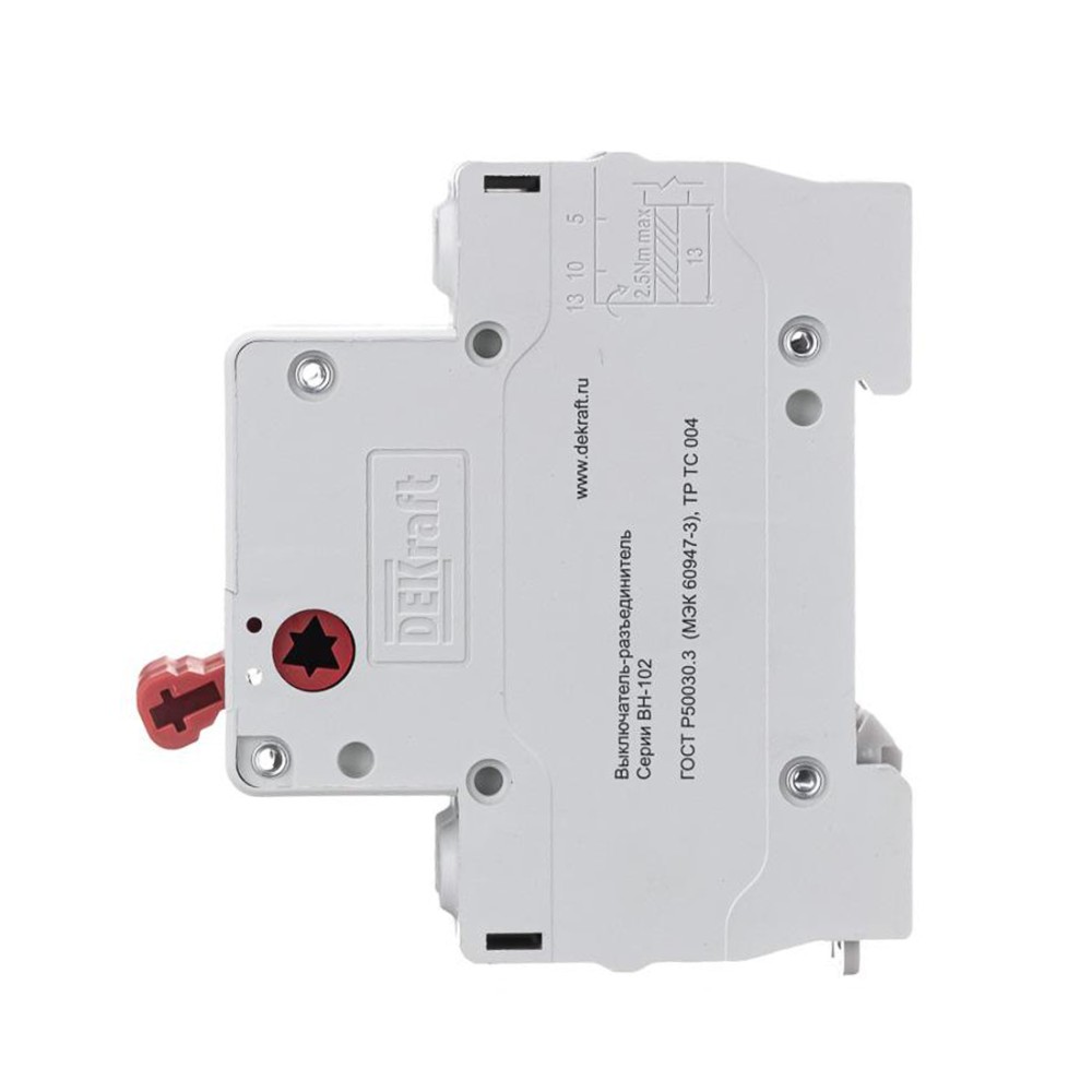 Выключатель-разъединитель серии ВН-102 DEKraft; 2P; номинальный ток 40 А; установка – на DIN-рейку; установочное положение - любое. Выключатели-разъединители применяются для ручного включения/отключения сетей напряжением до 400 В. Специальные мостиковые контакты обеспечивают надежный разрыв цепи; они полностью исключают возможность перекрытия дугой по изоляции. Усиленная рукоятка управления обеспечивает большое количество включений/отключений.