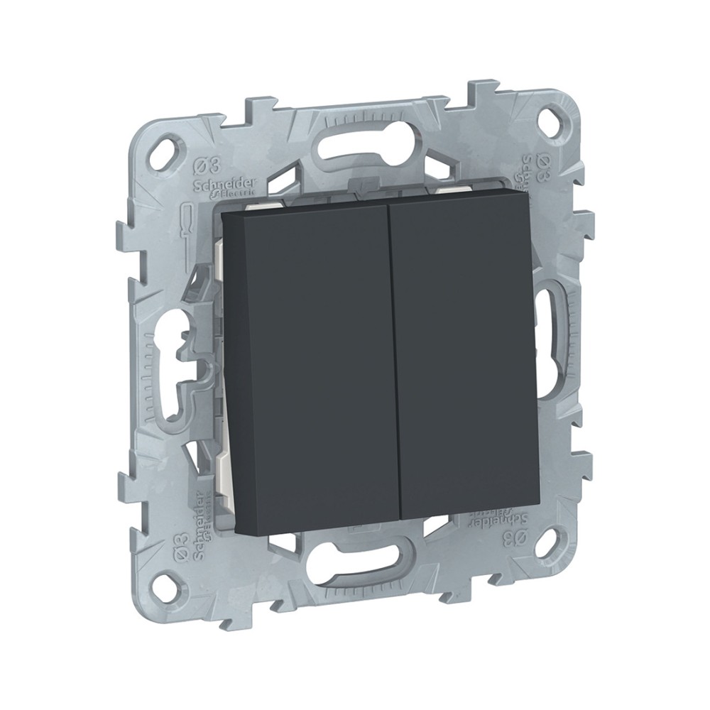 Переключатель двухклавишный Schneider Electric UNICA NEW (антрацит) без подсветки предназначен для сетей до 250 В на ток до 10 А. - 2 переключающих контакта. - Специальные направляющие для облегчения ввода кабеля. - Переключатель позволяет управлять одним источником света из двух точек.
