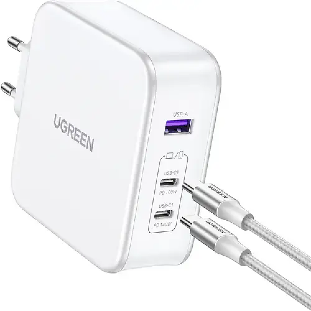 Сетевое зарядное устройство Ugreen CD289 2C+U 140W EU GaN Tech Fast Charger c кабелем 1.5м- новое поколение мощных зарядных устройств собранных на полупроводниках на основе нитрида галлия GaN (Gallium Nitride). Использование кристаллов из новых материалов дало возможность уменьшить вес и размеры зарядного устройства на 30% без потери его производительности.