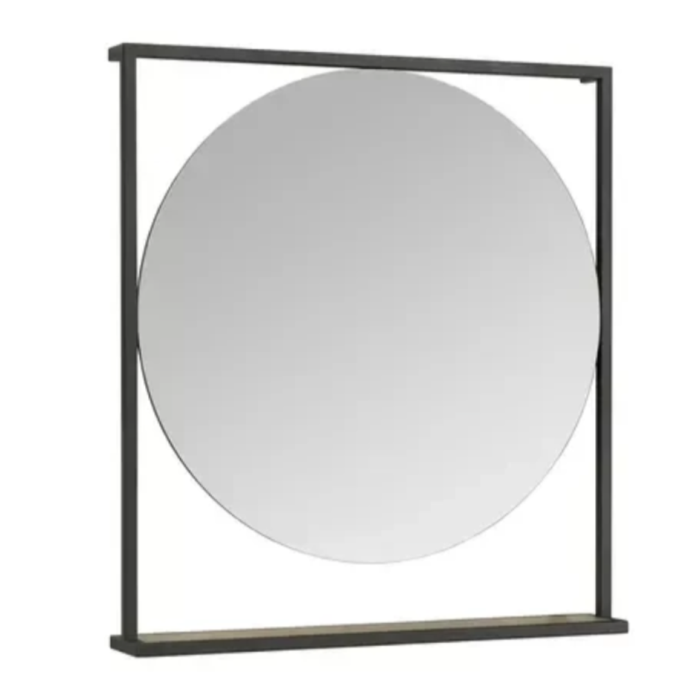 Зеркало Лофт Фабрик в размере 80 отличается необычным оригинальным дизайном и удобным функционалом. Черные металлические профили обрамляют круглое зеркало, под которым находится полочка из влагостойкой ламинированной плиты в цвете Дуб Эндгрейн. Открытая полочка удобна для косметических и декоративных мелочей, которые всегда должны быть под рукой.